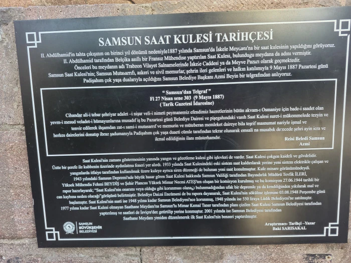 Samsun'dan Telgraf - 9 Mayıs 1887 (Tarih Gazetesi İdaresine) "Cihandar-ı ali-tebarın şerefiyle adalet-i nişar ve fı vali-i nimet-i payane-miz efendimiz hazretlerinin bütün akvam-ı Osmaniye'nin bade-i saadet ve yevm-i mesaili veladet-i hümayunlarına müsadif iş bu Pazarertesi günü Belediye Dairesi ve rışenşahındaki vasat-ı Saat Kulesi suret-i mükemmelede tezyin ve tenvir edilerek ilhamisından zat-ı sami-i mutasarrıf ve memurini ve milletin menkulatı dâreye telâfi teşarını narıyle işmâl ve herkes dairelerini donatıp ibrazı şadumanyla Padişah'ın çok yaşa duası cünile tarafından tekrar olunarak enafi-i musahık-ı zecede şehri ayin icra ve ikmâl edildiğinin ilanı müslemdardır."